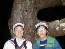 夏も終わりに近くだいぶ肌寒くなってきましたが、大学生のお客様と行ってきました。最初の1本目の古木でカブトオス2匹、メス1匹発見!穴の中にコクワガタを発見しましたが残念ながら手の届かない場所へ逃げてしまいました。そのあと数匹のカブト虫を発見しました。場所を他へ移動してノコギリクワガタオスとデカイカブトのオスとメスを捕まえました。この写真がその古木の前での記念写真です。後ろにカブト虫がいるのがわかりますか?捕獲したカブト虫は翌日森へ返してあげました。