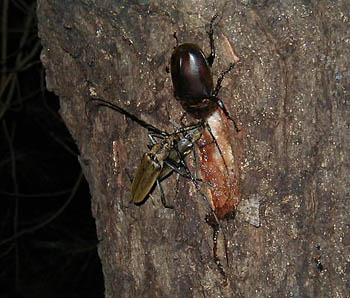 雨にも関わらずクワガタ捕りに行ってきました。夜8時に出発して11時に帰ってきました。成果はカブト虫おす15匹、メス22匹、コクワガタオス2匹、メス1匹、ノコギリクワガタオス1匹でした。雨で気温が低いわりには予想どおりの収穫だったと思います。