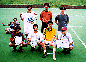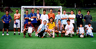 赤上勝之、井上雅之、渡辺潤、沢村和夫、岡田寛、下条、田畑 東京中野から参加。平均年令35歳。サッカー歴は長くサッカーを語らせたら酒のピッチも弾む面々。よって前日は深夜3時過ぎまで飲んでしまった...。 |